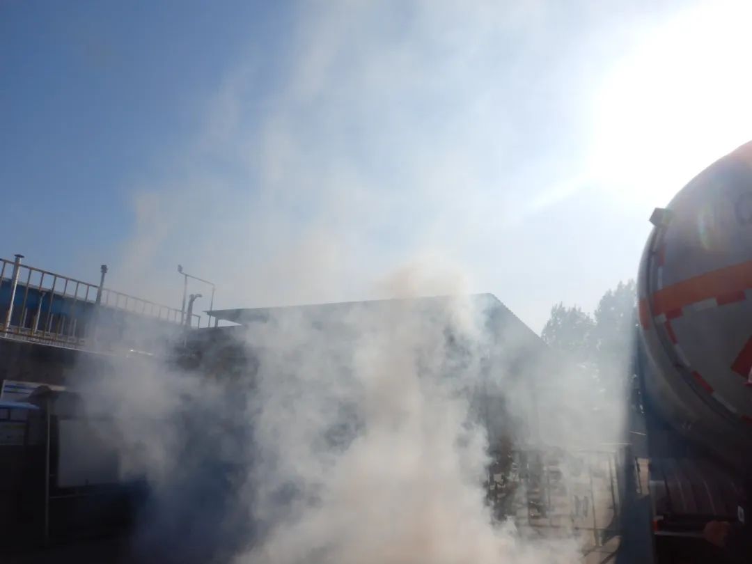1.卸車鶴管脫落,大量二甲醚從槽車和鶴管之間噴射而出。司機見狀,及時拉起槽車后的緊急切斷拉桿后緊急撤離。