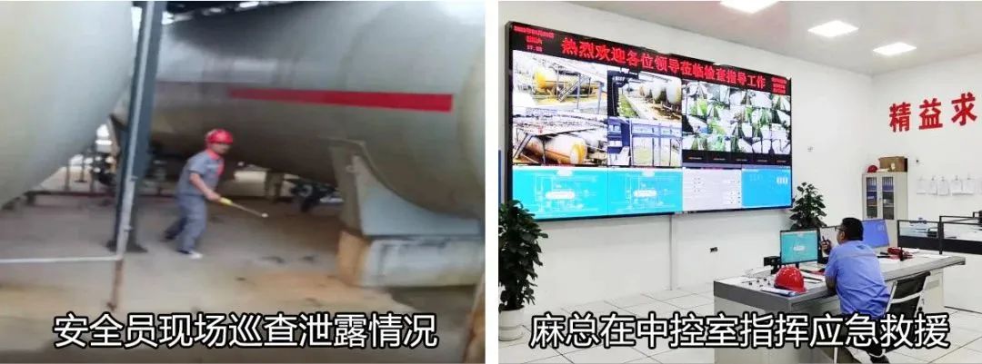 一、2023年6月24日17點整,中控室值班人員黃碟發(fā)現(xiàn)氣體罐區(qū)可燃?xì)怏w報警器報警,立即用對講機(jī)呼叫運營部安全員到現(xiàn)場核實,安全巡查人員代莘軒到現(xiàn)場發(fā)現(xiàn)丙丁烷儲罐液相出料管道泄露,立即向運營部經(jīng)理匯報情況,運營部經(jīng)理了解情況后立即向公司領(lǐng)導(dǎo)報告。公司領(lǐng)導(dǎo)立即趕撲中控室調(diào)出罐區(qū)監(jiān)控畫面,看到泄露情況較嚴(yán)重,立即啟動公司綜合應(yīng)急救援預(yù)案,在中控室進(jìn)行了液化氣泄露事故應(yīng)急救援指揮。