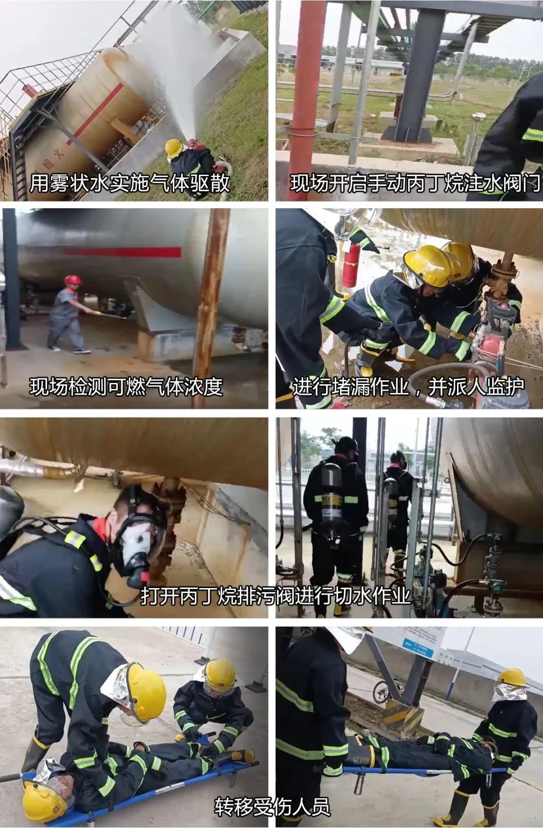 四、搶險救援組長孫雪峰帶領(lǐng)代莘軒、文亮開啟事故應(yīng)急池進(jìn)口閥門,用消防霧炮將防火堤內(nèi)泄露的丙丁烷用霧狀水增濕稀釋將漏出沉積在地面上的氣體驅(qū)散;魏全新指揮楊勇澤和郭明穿戴防護(hù)服及正壓式呼吸器趕撲防火堤內(nèi)開啟手動丙丁烷注水閥門后命令向陽啟動注水自動閥門向罐內(nèi)注水,保持泄露處無液化氣泄露而是水泄露。安全員黃明暉負(fù)責(zé)測試現(xiàn)場濃度用“便攜式可燃?xì)怏w檢測報警儀及現(xiàn)場報警儀顯示”檢測周圍的濃度 ,符合要求后停止霧狀水噴霧。石志紅帶領(lǐng)兩名的堵漏人員全副武裝迅速進(jìn)入了罐區(qū),對丙丁烷罐泄漏法蘭進(jìn)行堵漏作業(yè),魏全新指揮黃磊,史國良準(zhǔn)備好滅火器進(jìn)行監(jiān)護(hù),且防止火災(zāi)事故發(fā)生,漏點得到有效的控制;魏全新命令向陽停止注水令楊勇澤、郭明打開丙丁烷排污閥將注入的水全部排放,命令向陽俞志超打開相應(yīng)的 丙丁烷罐與應(yīng)急罐的轉(zhuǎn)料的閥門,開啟轉(zhuǎn)料泵將丙丁烷倒入應(yīng)急罐中。由于泄漏點泄漏嚴(yán)重,在堵漏過程中陳浩手部腳部被凍傷,不能行走。魏全新立即命令史國良、黃磊等早已準(zhǔn)備 好的擔(dān)架將傷者抬出事故現(xiàn)場。